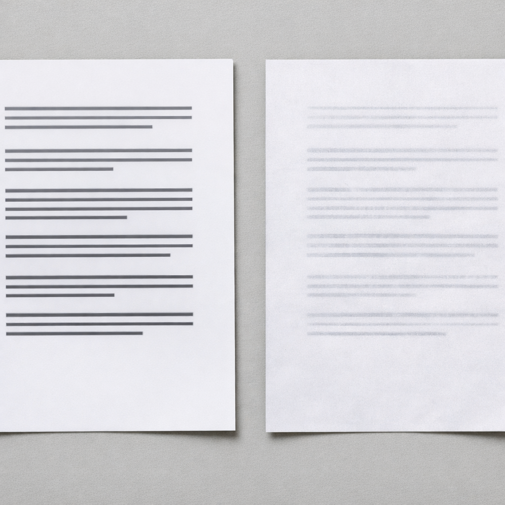 Các vệt trắng dọc xuất hiện giữa trang giấy là dấu hiệu kinh điển. Chữ in có thể bị mờ nhạt, không rõ nét như trước. Đôi khi màu đen không đều, một số chỗ đậm một số chỗ nhạt khó đọc.